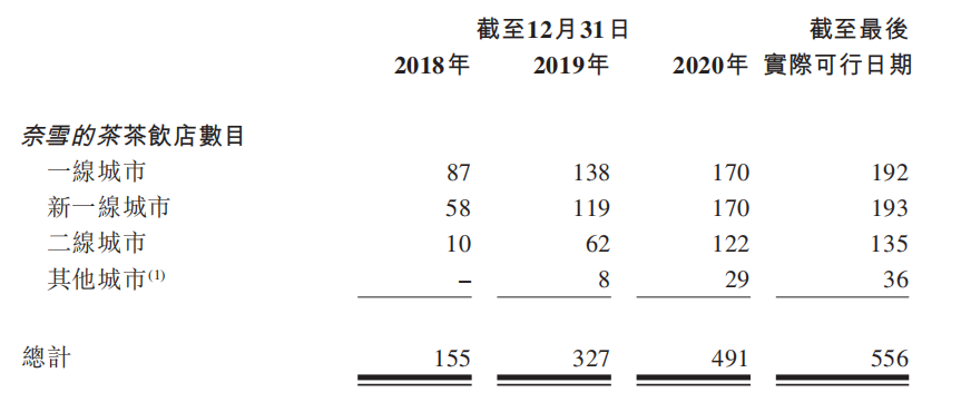 2018年12月底,奈雪的茶门店数量已经达到155家;2019年底则翻倍至327家;2020年,门店数量进一步增长至556家。