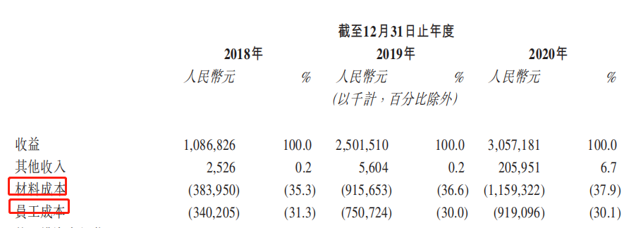 根据招股书提供的利润表,截止至2020年,材料成本占总营收比重高达37.9%,而员工成本占比达到30%,合计达到68%。