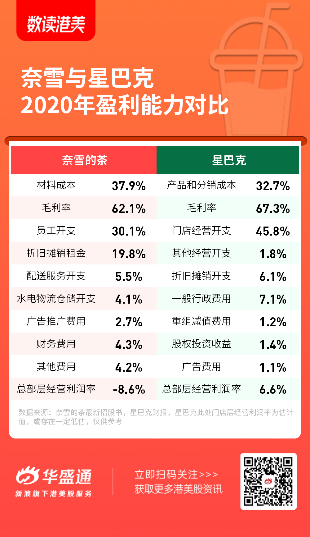 据2020年实际财务数据,奈雪的茶、星巴克的毛利率分别为62.1%、67.3%,总部层利润率分别为-8.6%、6.6%。