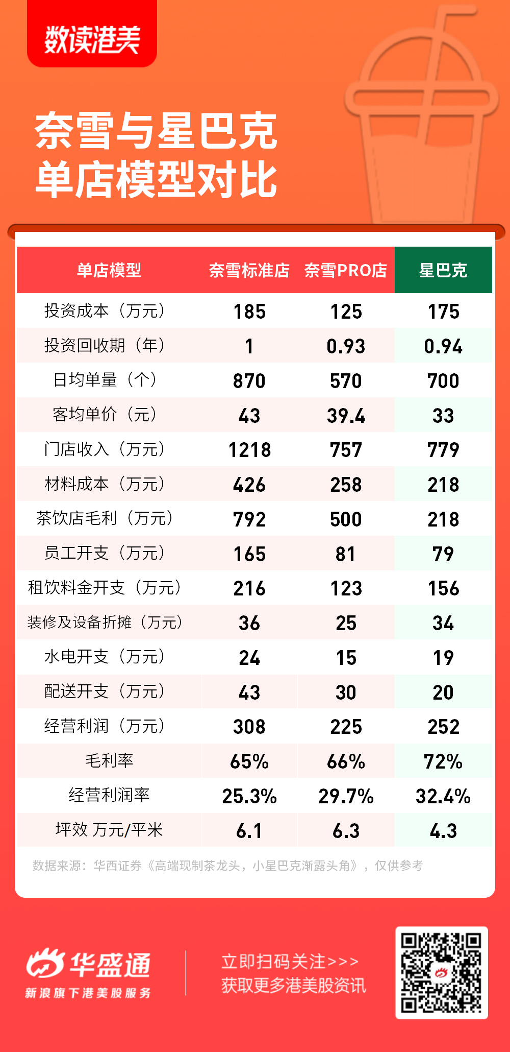 目前奈雪与星巴克在单店面积、投资成本方面比较接近,随着单店经营逐步成熟,有券商预计,奈雪的日均单量和坪效将超越星巴克。