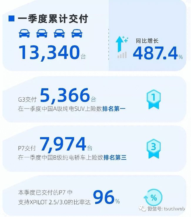 小鹏汽车2021年第一季总交付量达13,340台,较2020年同期的2,271台增487%。一季度交付的P7 中, 96%支持XPILOT 2.5 或 XPILOT 3.0。