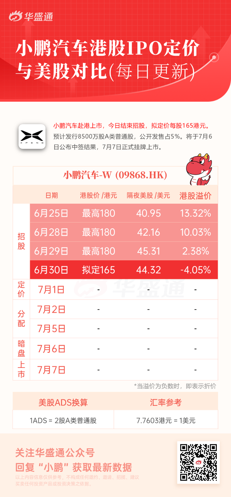 小鹏汽车据悉将香港IPO指导价定在165港元/股,较隔夜美股44.32美元,港股定价折让4.05%。