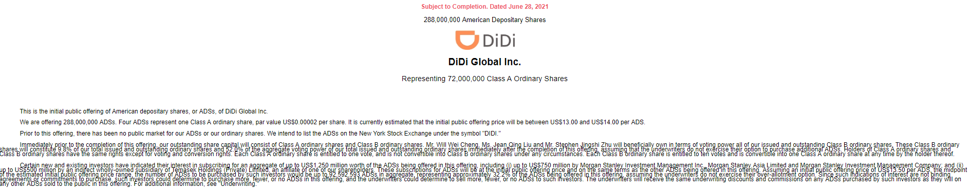 6月30日,据彭博社报道,中国打车巨头滴滴(DIDI)将IPO发行价确定为14美元/ADS,位于13-14美元的发行区间价格上限。