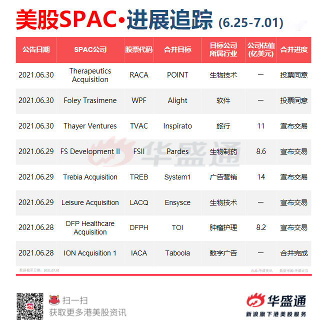 交易方面,在刚刚过去的这一周时间中,新增8宗合并交易,其中较受关注的是,全渠道客户获取平台System1与Trebia Acquisition Corp.的合并,合并后的公司预计将在纽约证券交易所上市,并以新的股票代码“SST”进行交易,该交易预计将于 2021 年第四季度完成。