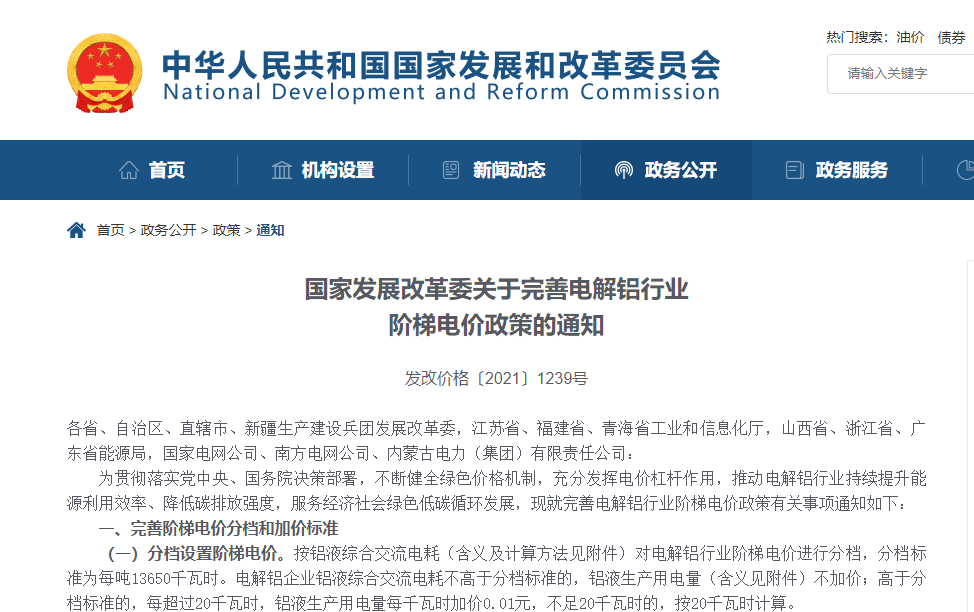 其中提到,严禁对电解铝行业实施优惠电价、组织电解铝企业电力市场专场交易等,已经实施和组织的应立即取消。严禁出台优惠电价政策情况纳入省级人民政府能耗双控目标责任评价考核。