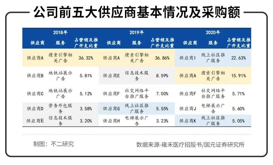 招股书显示,2020年雍禾医疗前五大供应商均为推广服务相关,共占营销及推广开支的55.9%,向供应商I采购线上社区推广服务1.15亿元,占营销及推广开支比重为22.63%,首次超过搜索引擎广告服务。