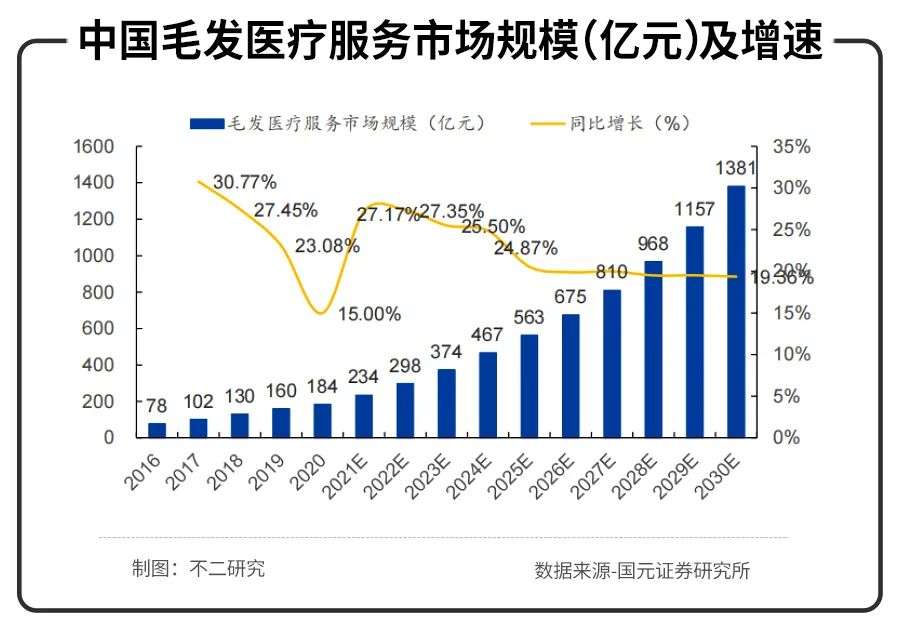 据弗若斯特沙利文报告显示,2020年中国毛发医疗市场市场规模为298亿元,植发市场和医疗养固市场未来均将高速发展,预计2030年市场规模将达1381亿元。