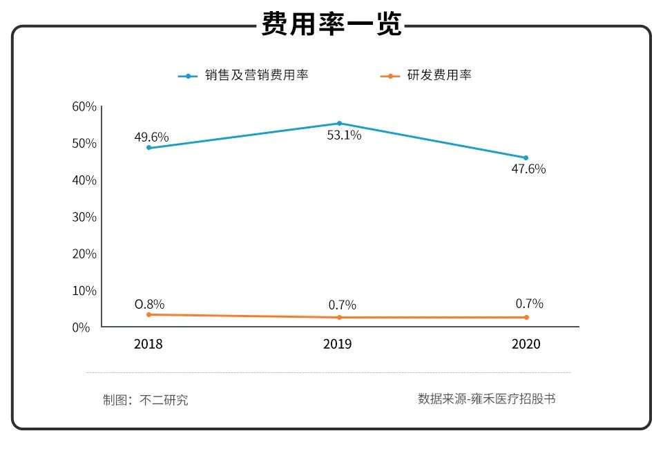 据招股书显示,2018-2020年雍禾医疗销售及营销费用率分别为49.6%,53.1%,47.6%。而同期的研发费用率仅为0.8%,0.7%,0.7%。
