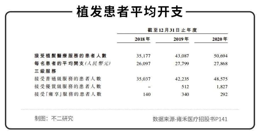 据雍禾医疗招股书显示,雍禾医疗将植发业务根据服务标准分为普通级、优质级和贵宾级三级服务,客单价2万元-10万元不等,其中接受普通级服务的患者人数占比超96%。