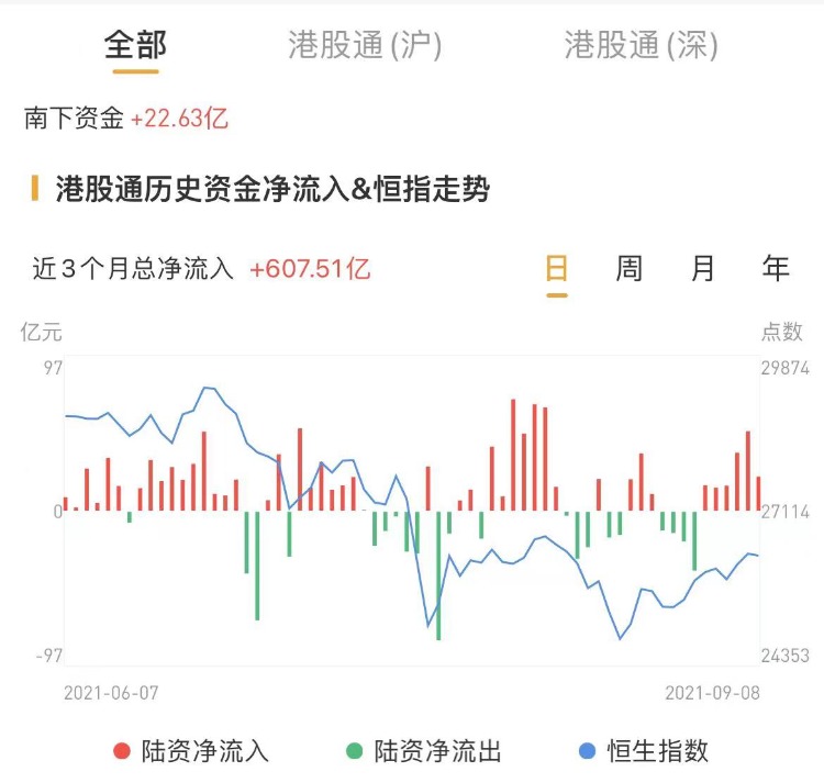 南下资金今日净流入港股22.63亿港元,昨日净流入21.41亿港元。