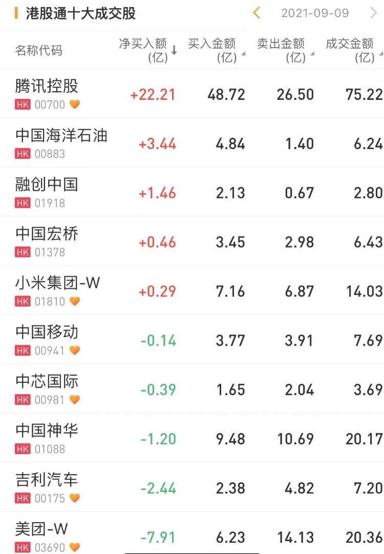 南下资金净买入腾讯22.21亿港元,为今日买入之最。此外,中国海洋石油获南下资金买入3.44亿港元。
