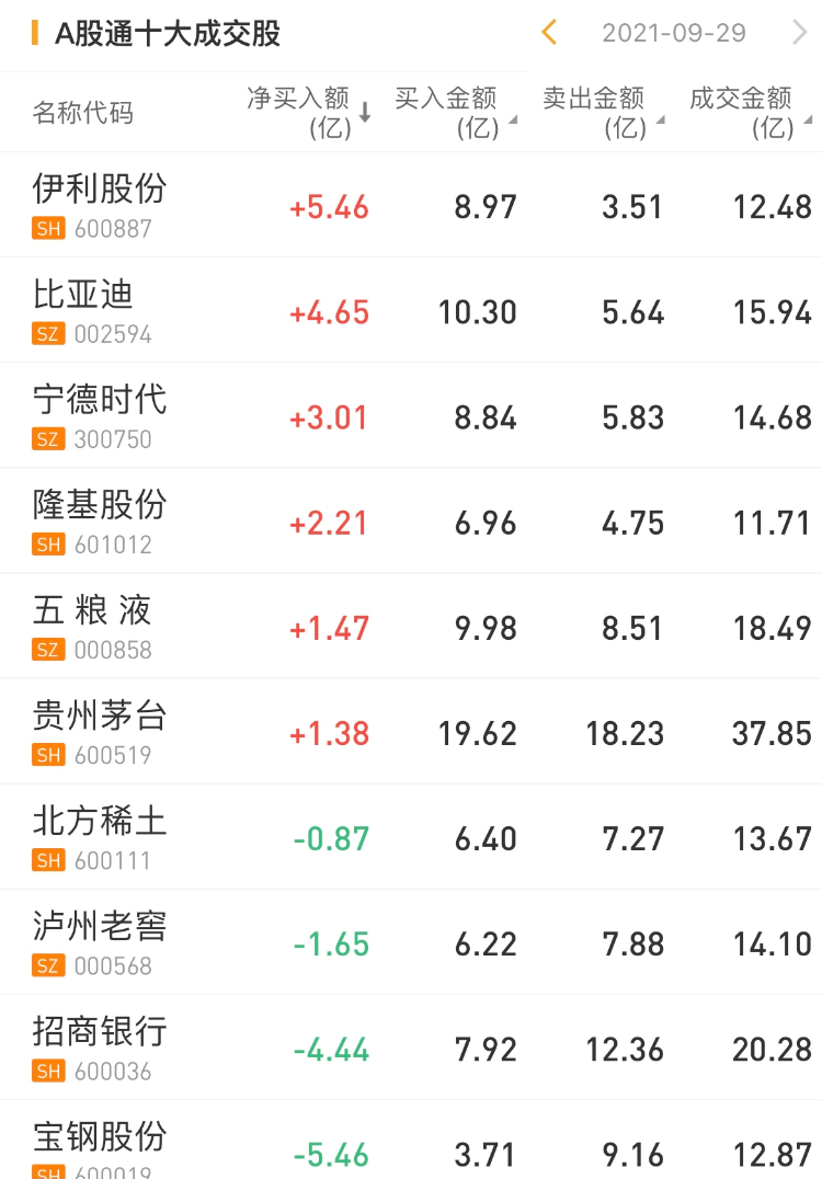 北上资金今日净买入伊利股份5.46亿元,为今日买入之最。此外,比亚迪获净买入4.65亿元,宁德时代获净买入3.01亿元。