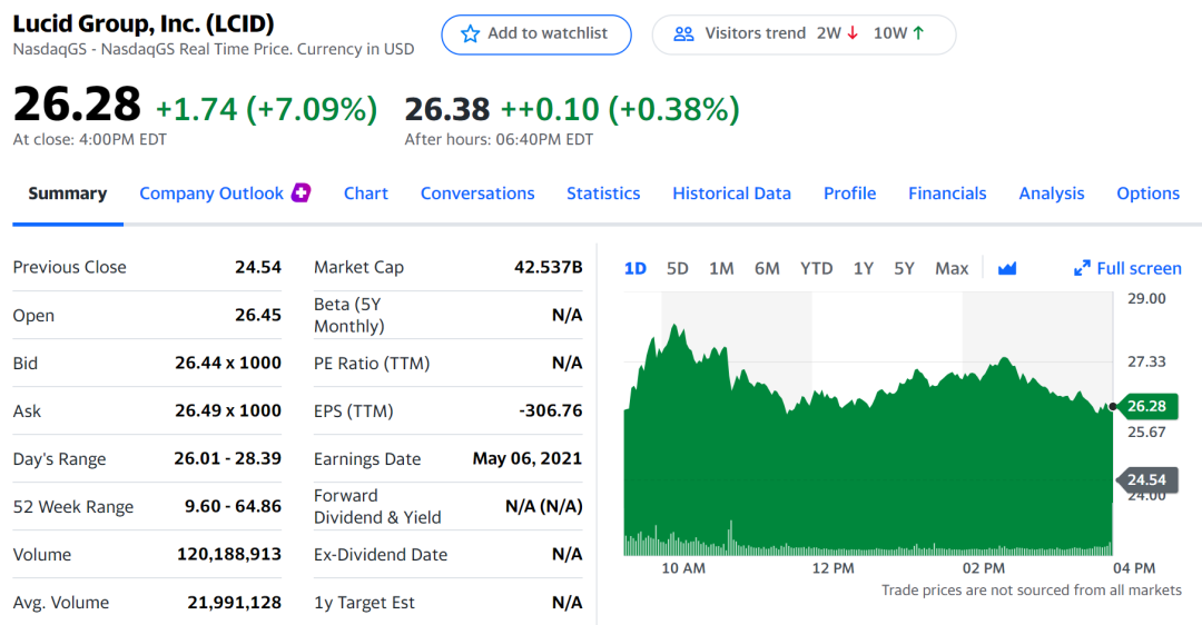 消息公布后,Lucid周三收涨7%,至26.28美元。