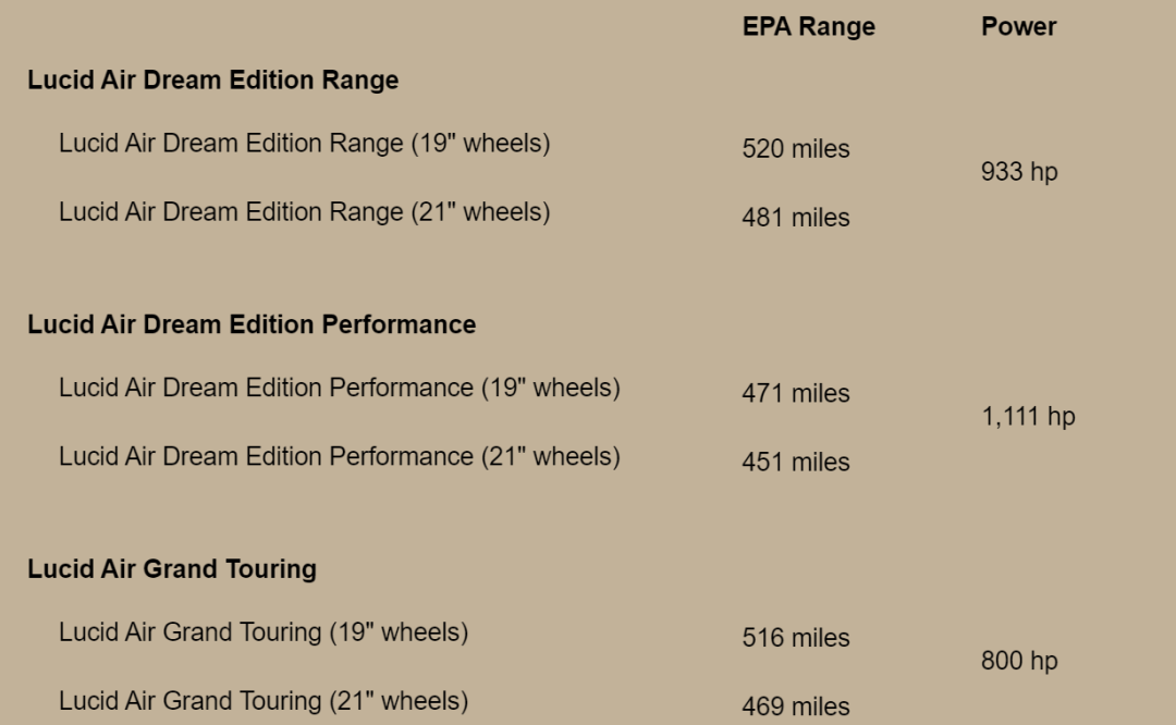 美国环保署(EPA)最近公布了Lucid Air Dream Edition range的官方里程估计,这是美国环保署评级的电动汽车中最长的里程:一次充电520英里(约合837公里),比其竞争对手特斯拉的Model S还多出了100多英里。Lucid Air Dream Edition的性能和Lucid Air Grand Touring也达到了EPA估计的范围,远远超过任何其他电动汽车。