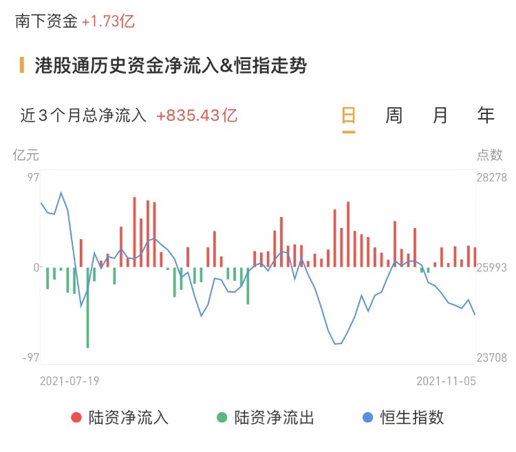 南下资金今日净流入港股1.73亿港元,前一交易日净流入19.73亿港元。