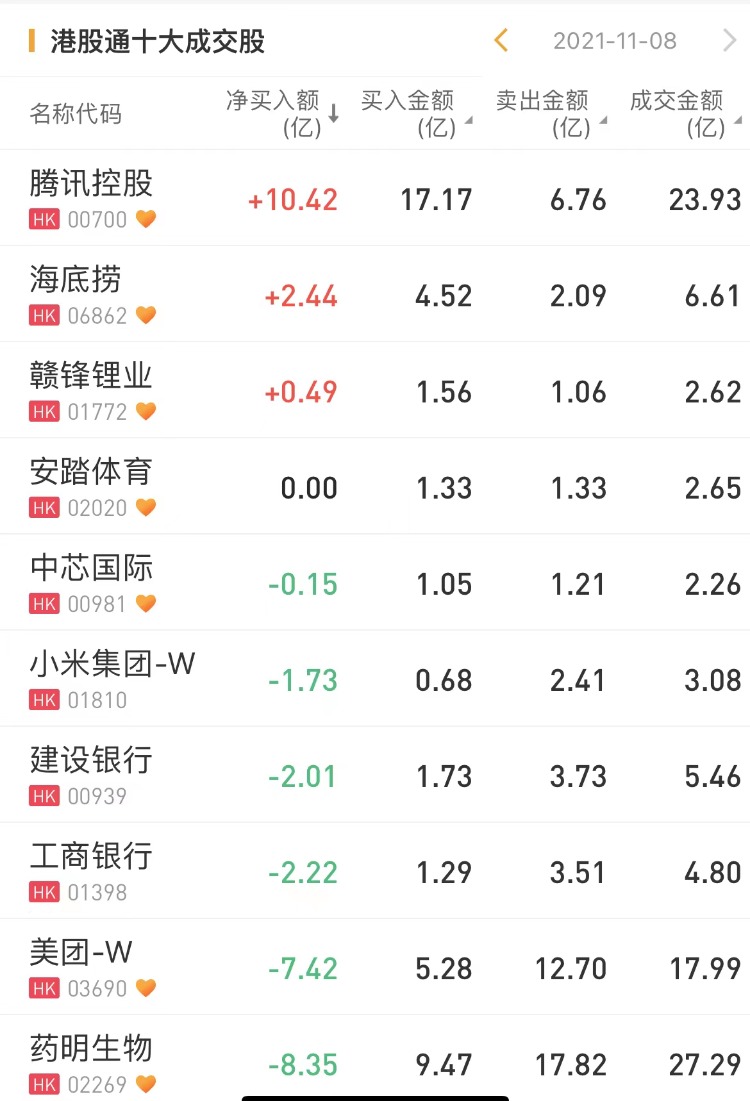 南下资金净买入腾讯控股10.42亿港元,为今日买入之最。此外,南下资金净买入海底捞2.44亿港元。