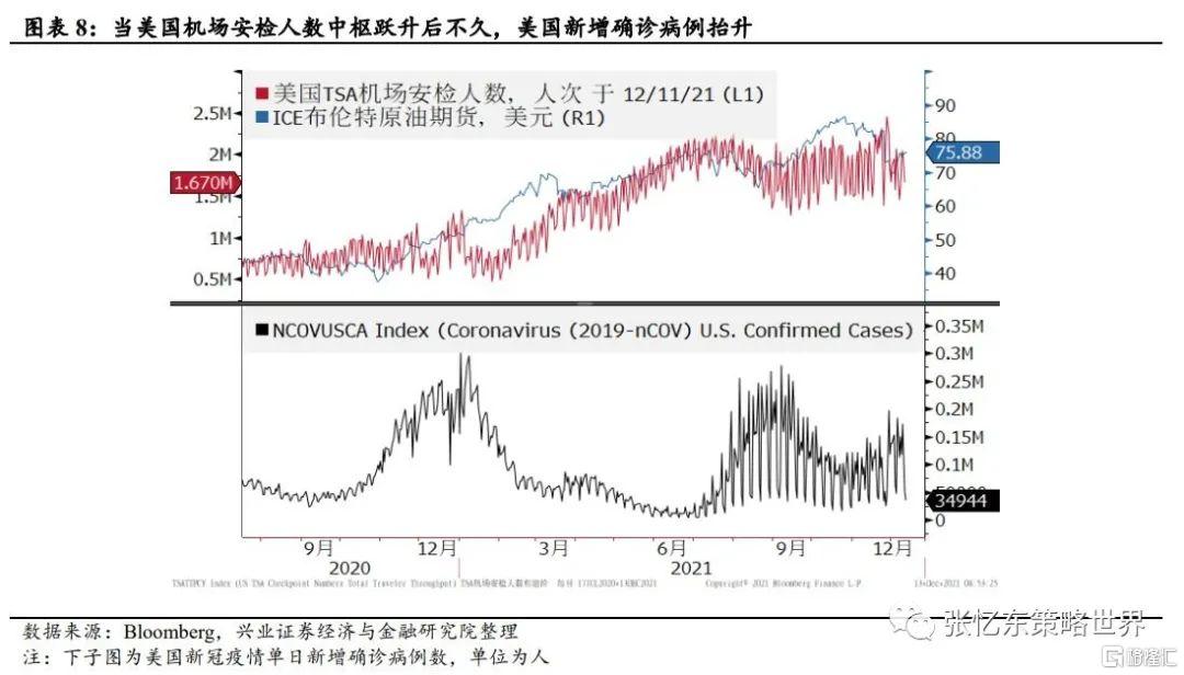 2021年每当疫情缓和、美国服务业进入修复阶段,长端利率都有上行动力;但之后,人员的流动带来更多的新增病例,进而对疫情的担忧提升,从而给长端利率施加下行的压力。当美国TSA机场安检人数中枢跃升后不久,美国新增确诊病例抬升,长端利率走低。这些阶段包括,去年6月份美国2次疫情冲击、今年7月份Delta variant冲击和今年11月底Omicron variant的恐慌性冲击和本土确诊。