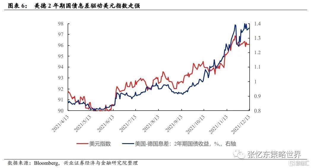 2021年年中以后,随着联储Taper路径的逐渐明朗化,2年期美债收益率呈现逐渐升高的态势,美国-德国2年期息差扩大带动美元指数走强,随着Taper逐步完成,加息日程预期迫近,短端利率将持续走高,这一趋势将延续到2022年Taper结束以后。
