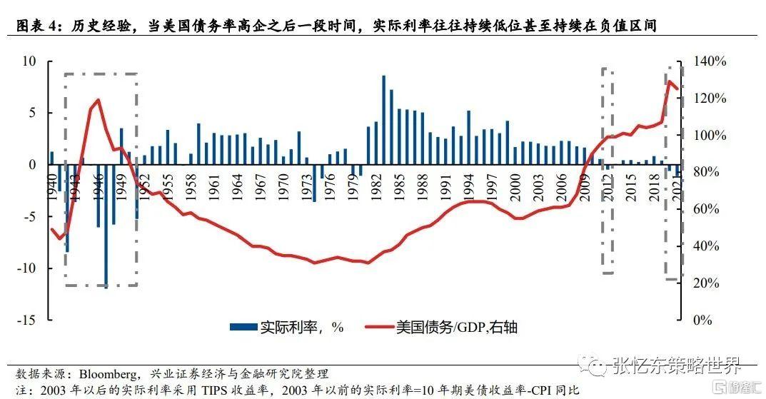 历史上,当美国债务率高企之后的控制阶段,实际利率基本上都是在负区间,试图在不恶化债务率的前提下促进经济增长。参考40年代后期到50年初,70年代滞胀期,2012年债务高增后以及当下(十年期实际利率在-1%左右)。