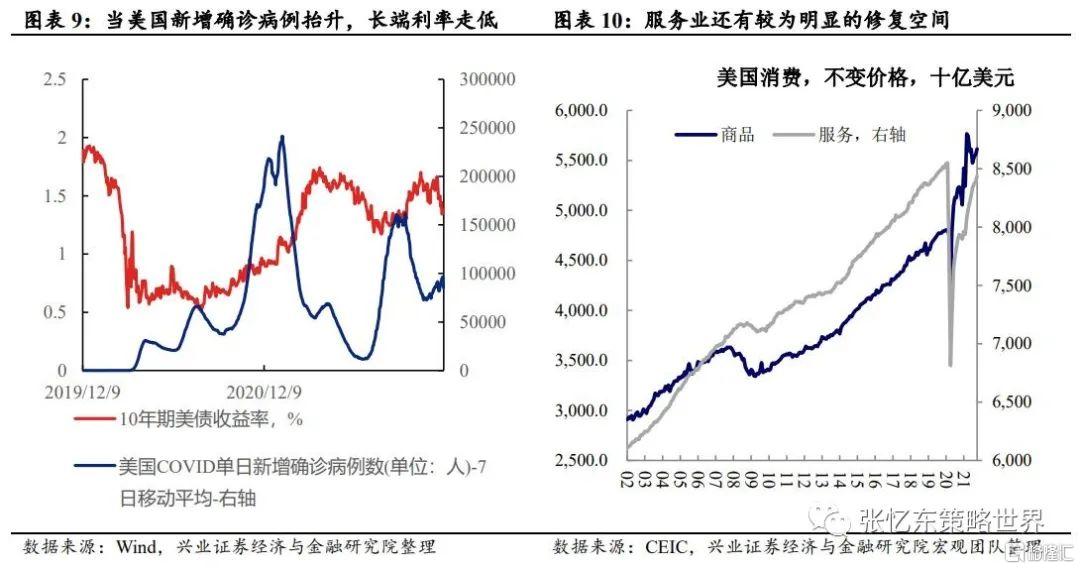 2022年上半年随着这轮Omicron疫情冲击的弱化,疫情“锁顶”效应将弱化,美国服务业还将有修复空间,长端利率有望短期加速上行。当前,美国的服务业实际消费低于长期趋势,商品消费则高于长期趋势,按照疫情冲击前5年期的样本,2014年2月-2019年2月间,按照不变价计算的服务业消费量/商品消费量约为1.86倍,截至2021年10月,这一数值仅为1.5;即便是考虑到服务业消费朝着长期趋势回归的中性情况下,也还有较为明显的修复空间。