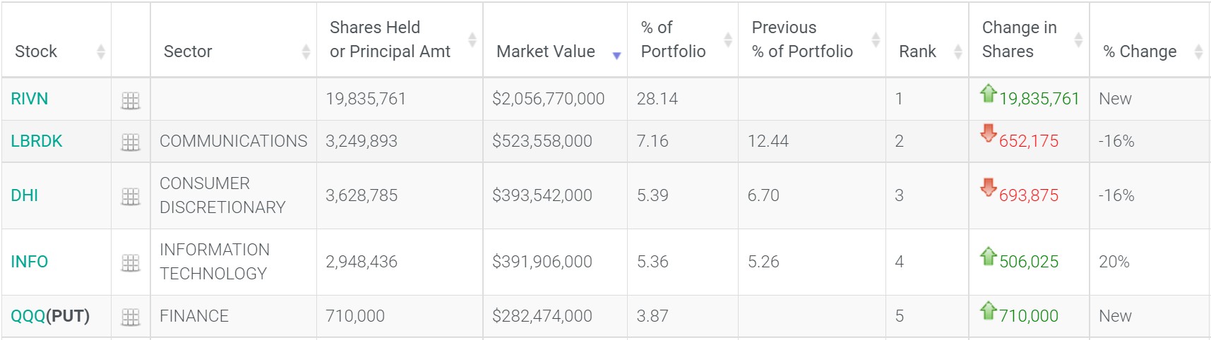 从持仓比例变化来看,前五大买入标的分别是:Rivian、纳指100 ETF看跌期权、Sea公司票据、塞纳、标普500指数ETF看涨期权(SPY.US,CALL)。
