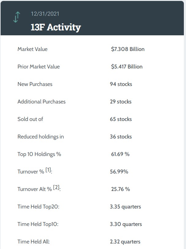 据统计,该基金四季度持仓总市值为73.08亿美元,上一季度总市值为54.17亿美元,环比增长34.9%。在四季度的持仓组合中新增了94只个股,增持了29只个股。同时,该基金还减持了36只个股并清仓了65只个股。其中前十大持仓标的占总市值的61.69%。