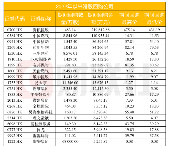 从回购金额排名来看,腾讯控股、中国燃气、中国移动、药明生物与三生制药的累计回购金额位居前五。另外,进入回购榜前十的港股上市公司还包括:小米集团、友邦保险、天伦燃气、敏华控股与易大宗。