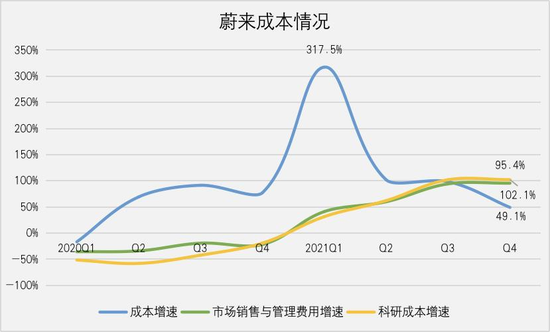 具体到成本侧,蔚来在销售成本方面依然保持着较高增速,这是阻碍其净利润扭亏为盈的主要因素。尤其是进入2021年以来,各类费用呈加速扩大的趋势,只是因为营收增速更高,覆盖了市场销售与管理费用,而获得正向毛利。然而由于整体运营成本居高不下,因此短期依然没有实现净利润为正。