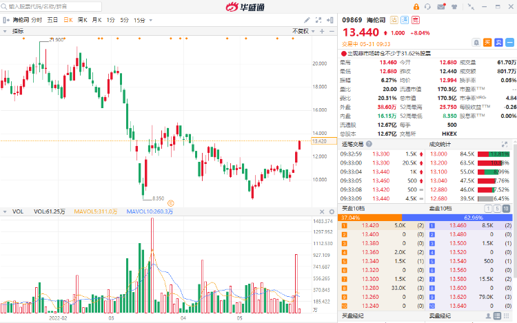 5月30日,港股餐饮、体育用品股走高,截至当日收盘,奈雪的茶大涨逾12%,李宁、九毛九涨10%,海底捞涨超9%。今日开盘,部分消费股续涨,海伦司两日涨逾23%,现报13.44港元每股。