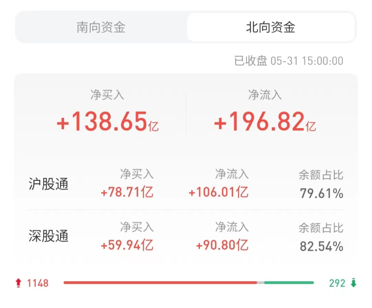 北上资金今日净买入138.65亿元,沪股通净买入78.71亿元,深股通净买入59.94亿元。上一交易日净买入70.49亿元。