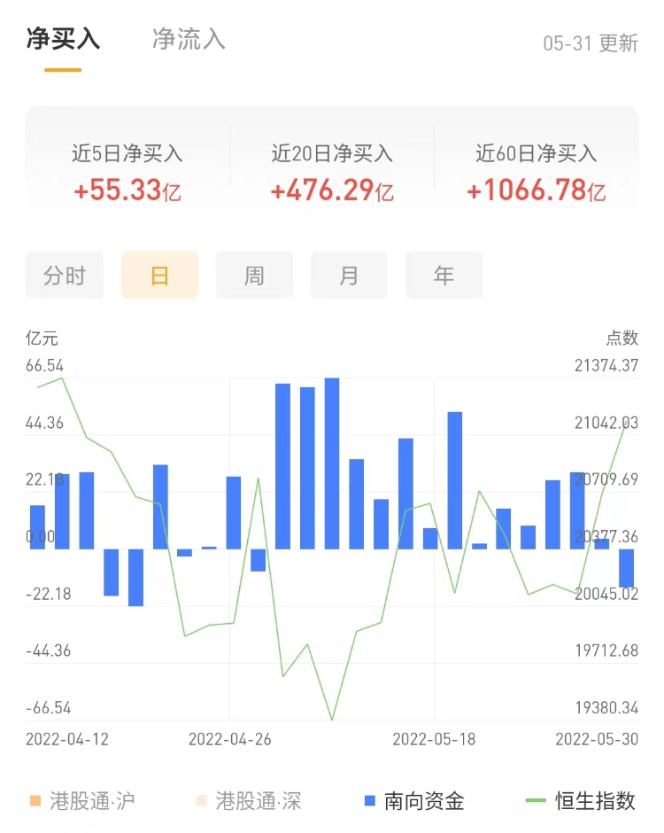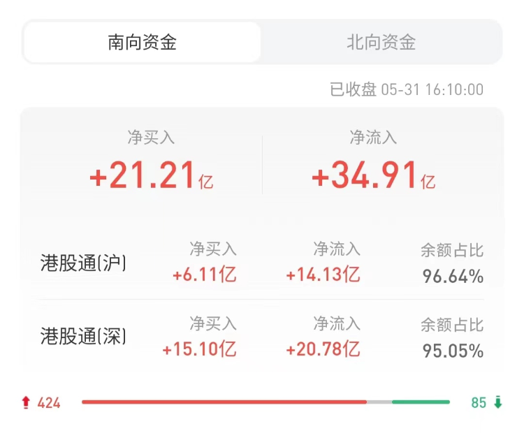 南下资金今日净买入港股21.21亿港元,其中港股通(沪)净买入6.11亿港元,港股通(深)净买入15.1亿港元。上一交易日净卖出港股14.76亿港元。