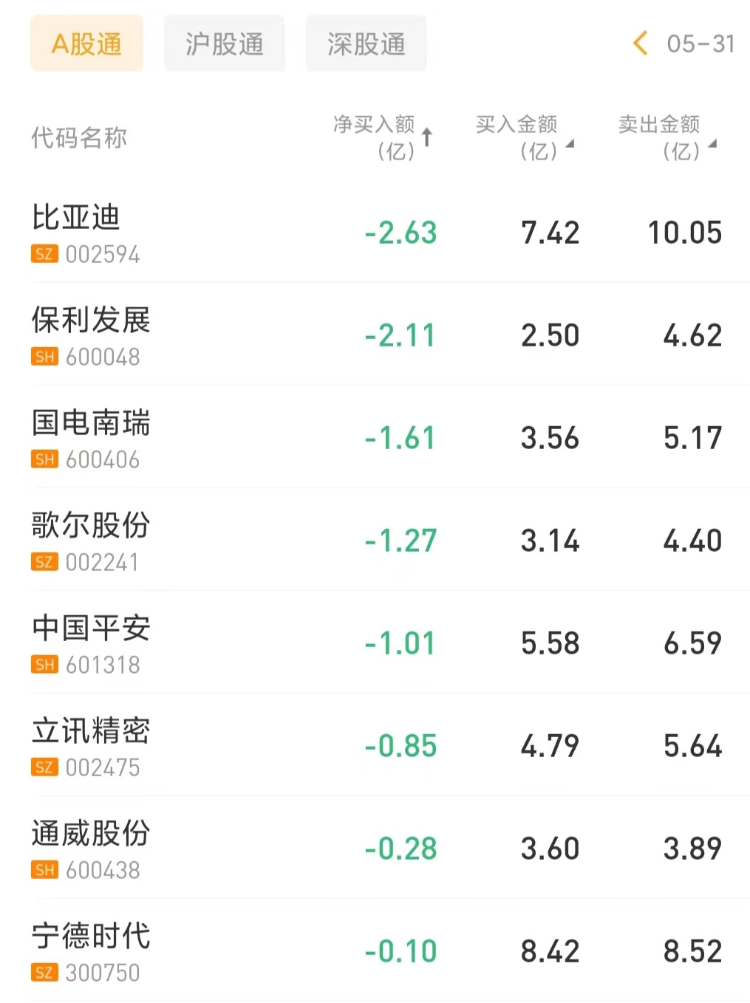 今日北上资金净卖出比亚迪2.63亿元,保利发展遭净卖出2.11亿元。