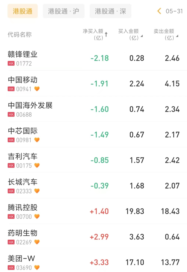 南下资金净卖出赣锋锂业2.18亿港元,为今日卖出之最,净卖出中国移动1.91亿港元。