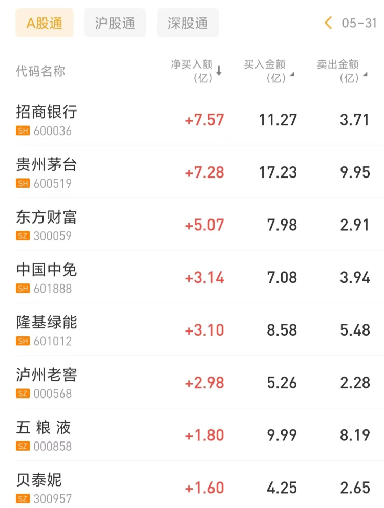 北上资金今日净买入招商银行7.57亿元,为今日买入之最;净买入贵州茅台7.28亿元。