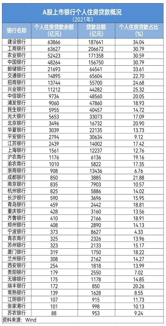 从2021年A股上市银行年报来看,六大国有行的个人住房贷款余额最高,其中建行、工行、农行均超过5万亿元。