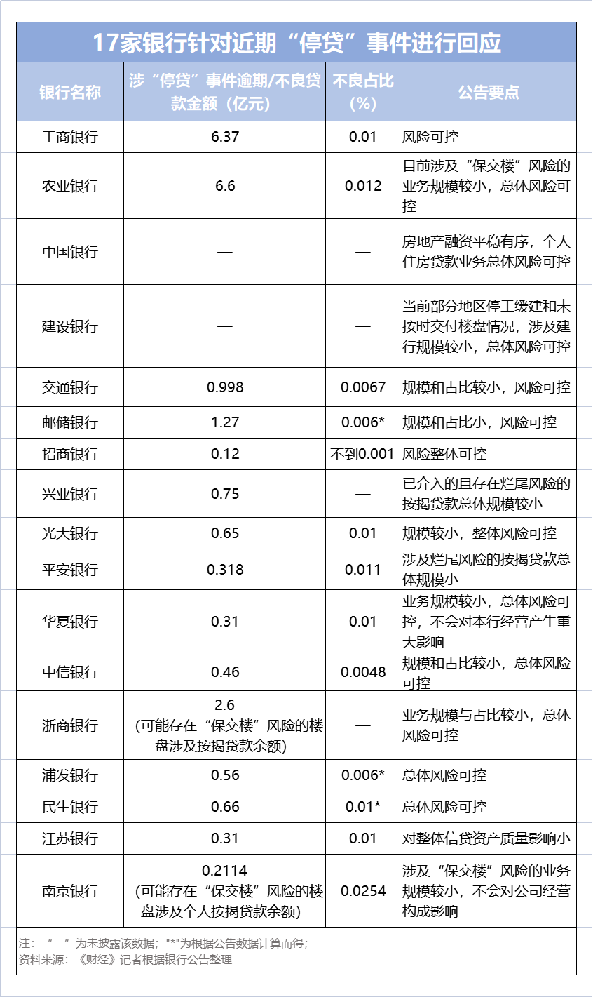 值得注意的是,截至7月15日发稿,已有包括工商银行(601398.SH)、农业银行(601288.SH)、中国银行(601988.SH)、建设银行(601939.SH)、交通银行(601328.SH)、邮储银行、招商银行、兴业银行、光大银行(601818.SH)、平安银行、华夏银行(600015.SH)、中信银行、浦发银行(600000.SH)、浙商银行(601916.SH)、民生银行(600016.SH)、江苏银行(600919.SH)、南京银行(601009.SH)等在内的17家银行发布公告,就相关问题进行回应。其中,大部分银行在披露停贷楼盘涉及的逾期按揭贷款金额的同时,均表示“风险可控”。
