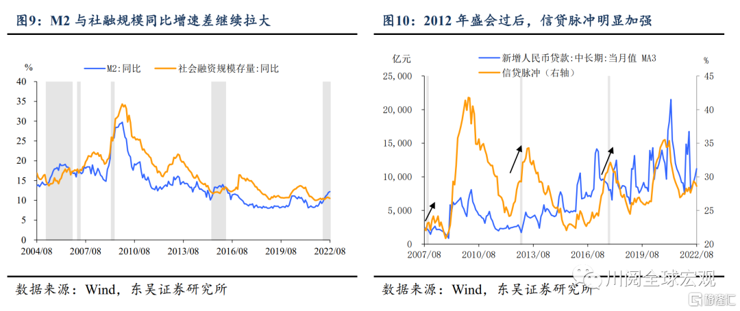 2012年大会过后,政策不确定性减弱,信贷脉冲明显加强,总体融资需求大幅上升。2012年5月我国经济增长出现明显回落,信贷脉冲指标触底。2012年5月至7月,央行降准叠加两次降息后,随后又在7月至8月两度上调逆回购利率,政策不确定性较强。然而大会结束后,信贷脉冲和中长期贷款明显走强。结合我们此前的报告,当前部委到位远好于2012年大会同期,后续经济政策落地的效率有进一步提高可能,预计四季度社融企稳的可能性较大。