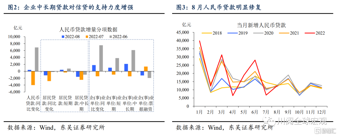 8月信贷结构出现超预期改善,票据融资呈同比少增态势。8月新增人民币贷款虽不及预期,但已回到正常阈值区间,同比多增390亿元。按部门来看,居民中长期贷款依然呈同比少增,而企事业中长期贷款则出现超预期增长,为推动新增人民币贷款规模增长的主因。