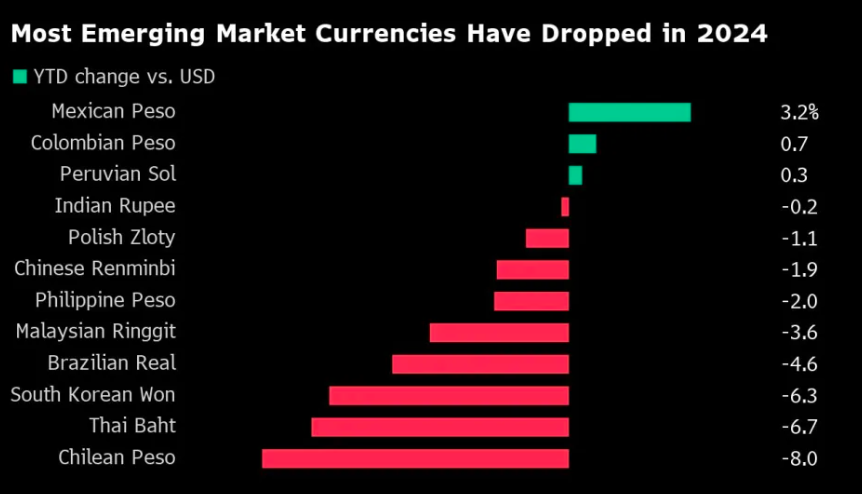 不少外汇市场的投资者,近来一直在关注着日本政府是否会入场干预,防止已经跌破153关口的日元进一步走弱。但其实,在新兴市场上,许多经济体面临的汇率压力,一点也不比日本少。