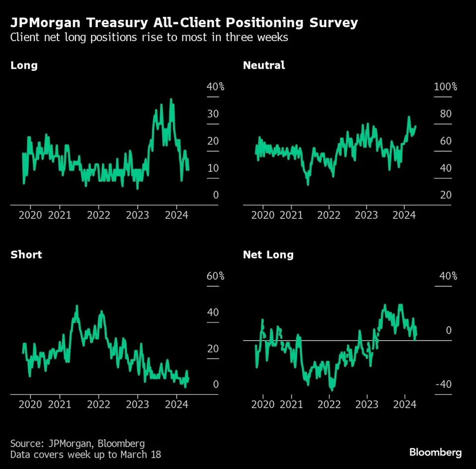 摩根大通最新调查显示,多头仓位下降4个百分点,空头和中性仓位上升2个百分点。由于现金投资者疲于应对避险需求和强劲的美国经济数据,本周市场变化不大。客户中的中性头寸已升至2月6日以来的最高水平。