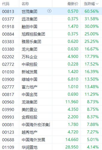 港股内房股除了停牌的中国恒大和碧桂园外,个股全线收红,世茂集团大涨超60%,融创中国 涨超30%,旭辉控股集团、雅居乐集团涨超25%,万科企业、龙光集团涨超15%。