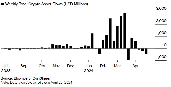 根据CoinShares Ltd周一发布的报告,截至4月26日的一周内,投资者从数字资产产品中撤资4.35亿美元。灰度比特币信托基金(Grayscale Bitcoin Trust)的资金流出量达到4.4亿美元,占整体资金外流的主要部分,这也是过去几周以来该基金规模最小的资金流出。