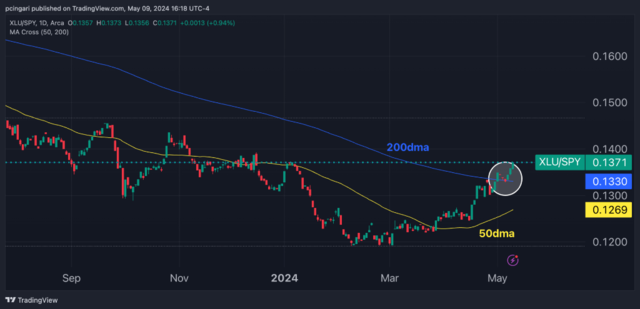 从技术面来看,分析师Turnquist指出,公用事业SPDR ETF与标普500指数之比扭转了长期下行的趋势,一年多来首次突破200天移动平均线——这表明公用事业部门有可能进一步跑赢大盘。