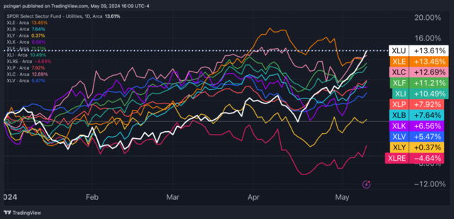 截至美股周四收盘,公用事业SPDR ETF(XLU)收于52周新高,报71.34美元/股,4月初以来累计上涨8.5%。今年以来累计涨幅超过10%,跑赢标普500指数和纳指,推升公共事业板块成为今年以来表现最好的板块。