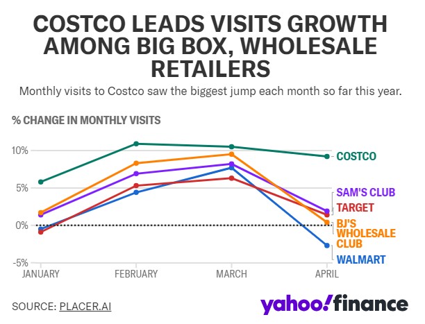 根据Placer.ai的数据,第一季度,好市多的客流量同比增长8.9%,相比之下,沃尔玛和塔吉特的客流量分别增长3.9%和3.5%。