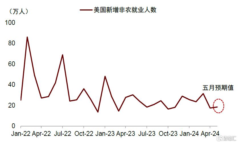 本周五即将公布5月非农就业数据,彭博一致预期非农就业人数将增加18.5万人,大幅低于3月新增就业人数31.5万人(图表8)。