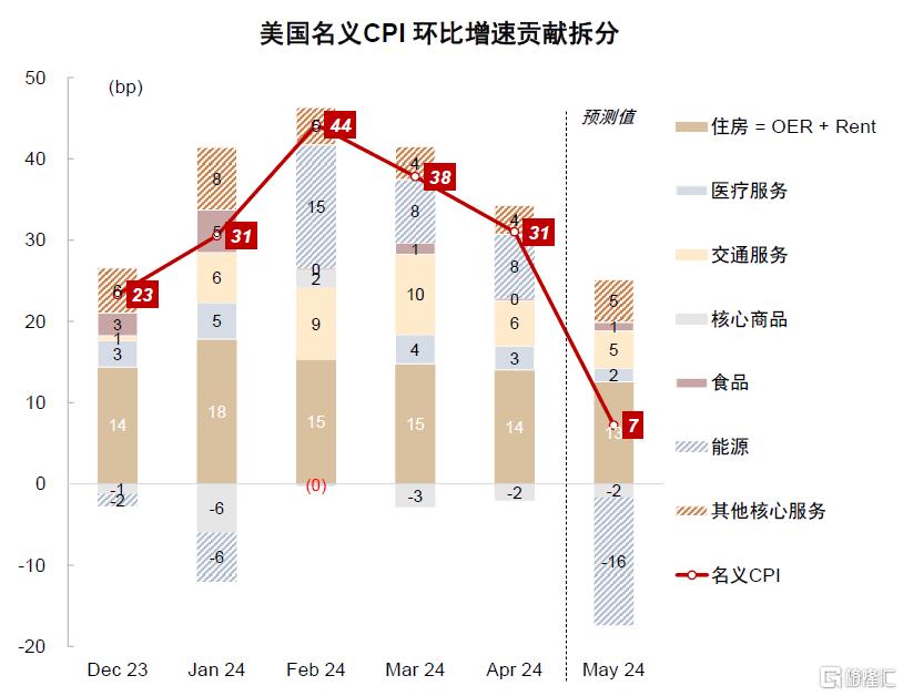 由于12个月之前通胀环比增速较低,基数效应导致通胀同比增速较前值变化不大,我们预测名义与核心CPI同比分别为3.4%与3.5%。往前看,美国通胀可能继续改善,只要不出现黑天鹅事件,模型预测CPI通胀今年会落到2.5%-3%区间,PCE落到2%-2.5%区间,没有观察到二次通胀的风险。