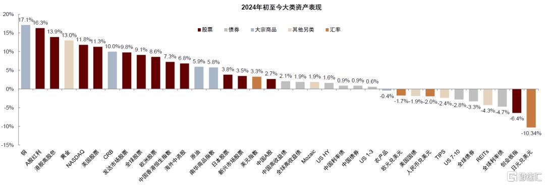 但是在本轮周期中,美债回报仅有1.8%,存在补涨可能。使用“利率预期+期限溢价”分析框架,十年期美债利率均衡价格在3.5%附近,目前美债利率仍有4.3%,具有充分下行空间。黄金过去2年表现亮眼,2024年至今累计回报13%,在全球大类资产中排名领先(图表15)。