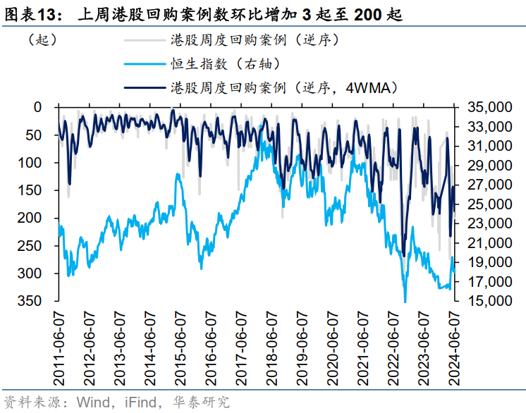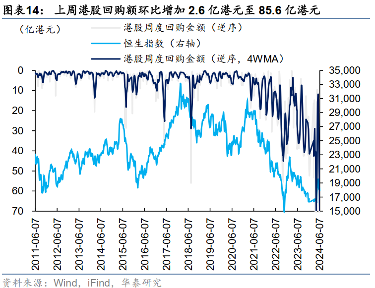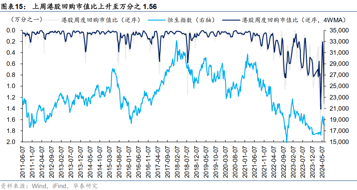 产业资本也为资金面提供支撑,上周港股回购热度继续攀升:回购案例数200起,较前一周(197起)增加3起;回购额85.6亿港元,较前一周(83.0亿港元)增加2.6亿港元,回购市值比上升至万分之1.56,均为年内次高峰(仅次于4.8-4.19两周)。