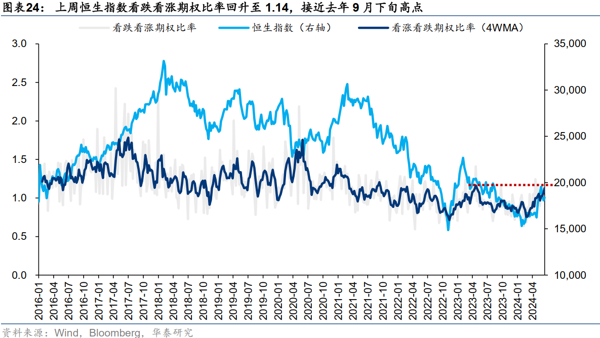上周恒生指数看跌看涨期权比率回升至1.14,接近去年9月下旬高点,或受两点因素影响:前期上涨中部分投资者(如对冲基金)寻求下行保护;近期调整中投资者情绪或已明显降温。
